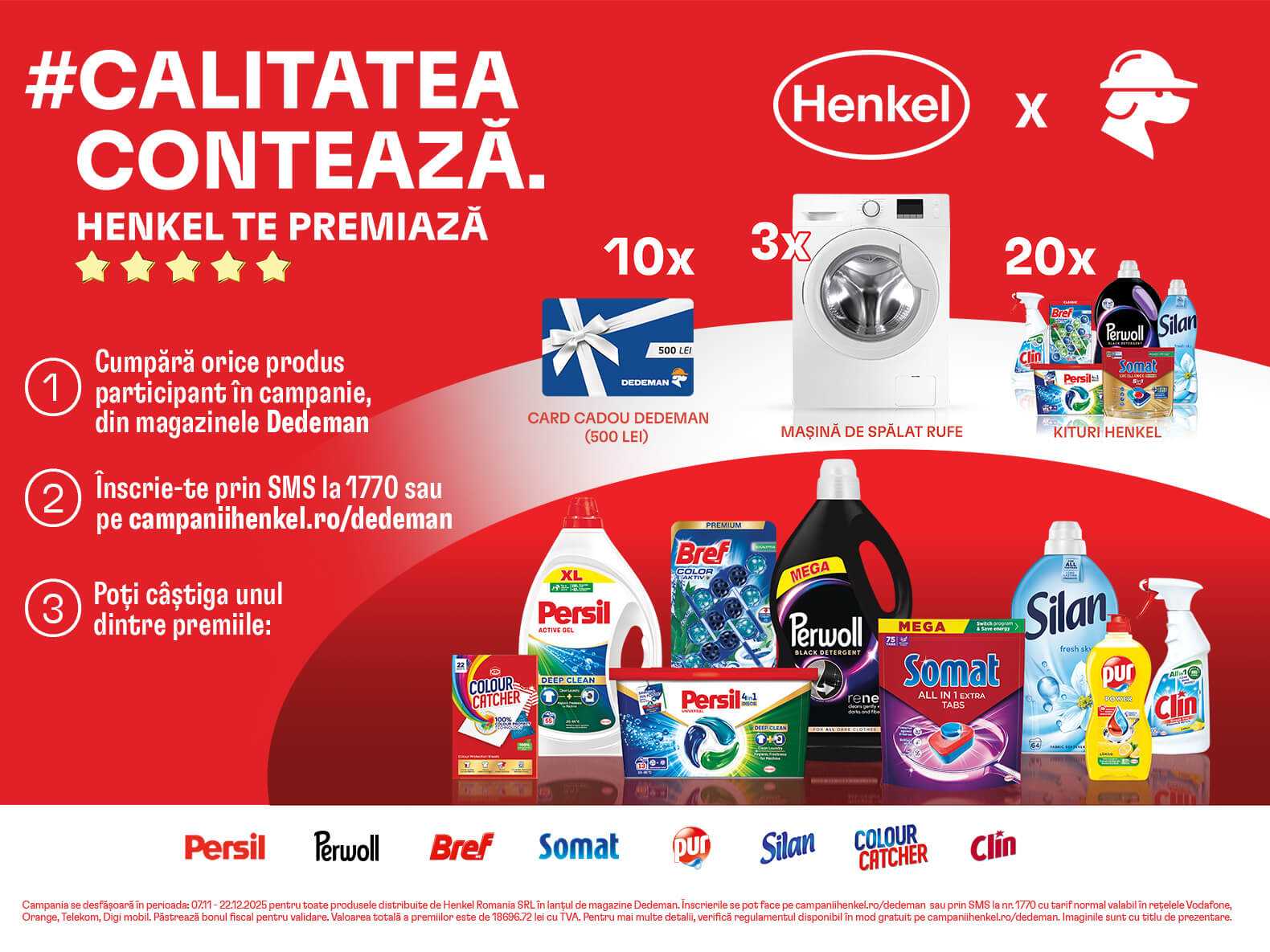 Cumpără orice produs participant în campanie: Persil, Perwoll, Bref, Somat, Silan, Clin, Pur, Colour Catcher, din magazinele Dedeman, înscrie-te prin SMS la 1770 sau completează formularul de mai jos și poți câștiga prin tragere la sorți unul dintre premiile: