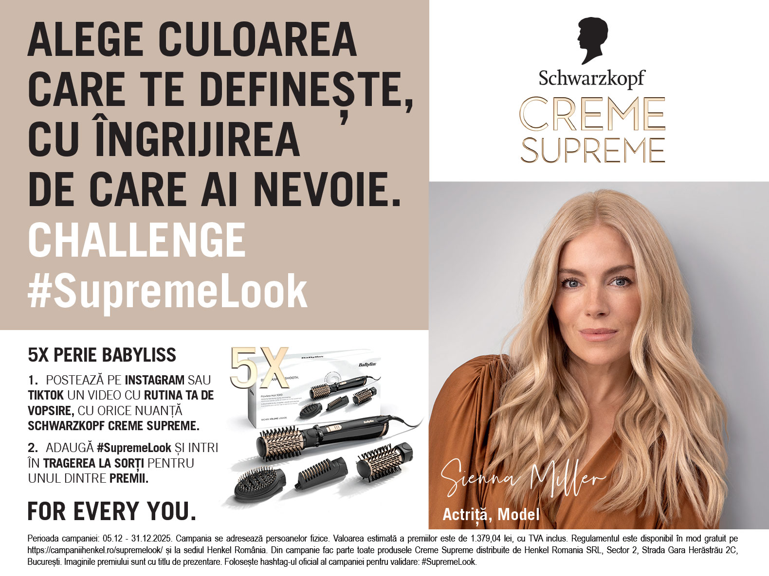 Postează un video cu rutina ta de vopsire pe Instagram sau TikTok, folosind orice nuanță Schwarzkopf Creme Supreme. Adaugă hashtag-ul oficial al campaniei – #SupremeLook – și intri automat în tragerea la sorți pentru unul dintre premiile oferite.